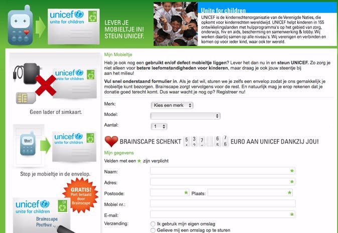 Tip 11 Via de website van Brainscape doneer je je oude smartphone aan Unicef.