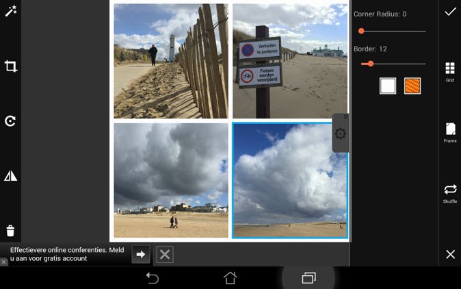 Heb je een keuze gemaakt, dan verschijnen de foto's netjes in de collage. Tik op de foto in een vakje en schuif om het mooiste deel van het plaatje in beeld te brengen. Stel eventueel de ronding van de hoeken (Corner Radius), de breedte van de randen (Border) en de kleur of het patroon van de achtergrond in en sla je fotocollage op.