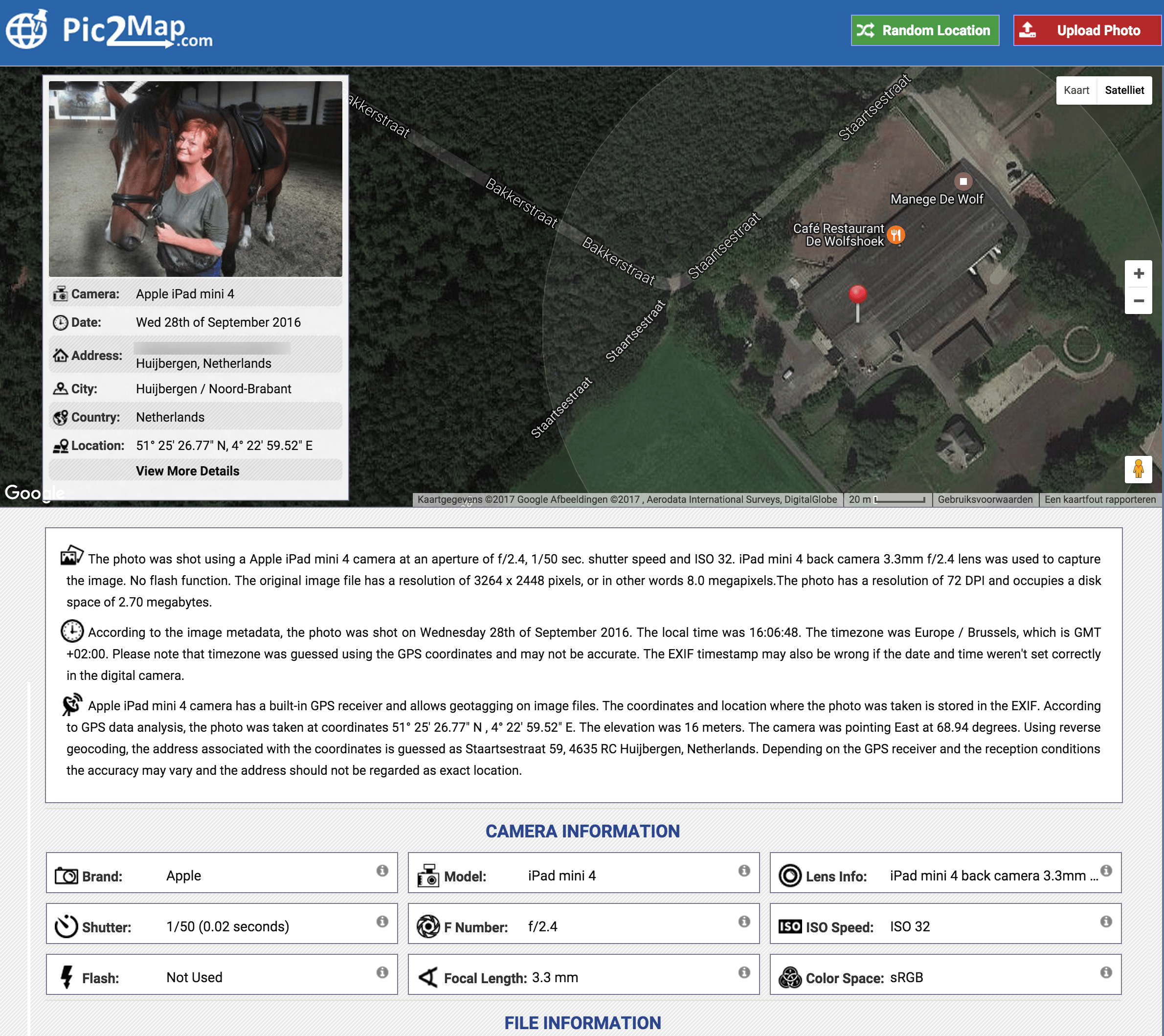 Wanneer de foto is voorzien van gps-coördinaten, hoef je geen computergoeroe te zijn om de plaats waar de opname is genomen te traceren. Surf bijvoorbeeld naar Pic2Map. Laad de foto op vanaf de harde schijf, dat kan door drag & drop. Even later verschijnt de locatie in de vorm van een rood pinnetje op de kaart of op het satellietbeeld. Scrol naar beneden om de camera-informatie, bestandsinformatie en datum- en tijdgegevens te zien. Met Pic2Map kun je dus de ook de locatie achterhalen van foto’s die op andermans blog staan.