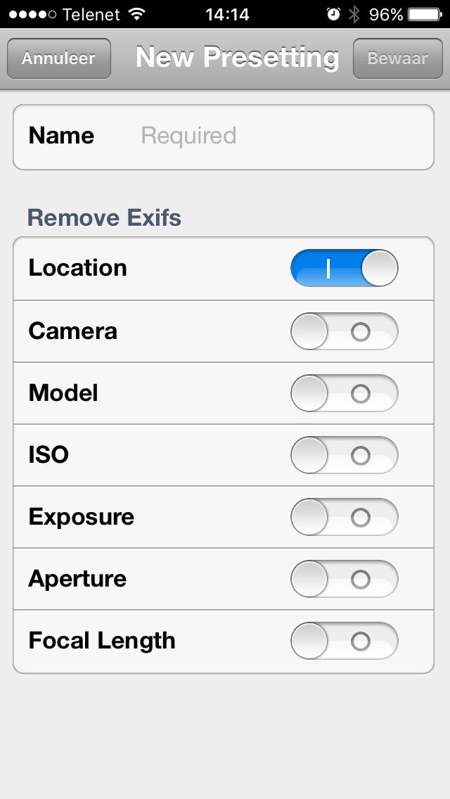 Ook voor iOS-toestellen bestaan er uitstekende exif-wissers. TrashExif is gratis. Je kunt metagegevens die je wilt verwijderen vastleggen in verschillende presets. Op die manier bepaal je wat wel en wat niet moet worden gewist. Vervolgens kies je een preset en daarna selecteer je de foto’s waarvan je deze extra informatie kwijt wilt. De app heeft zelfs een QuickRemove-functie om razendsnel de metadata te wissen van de laatste foto’s die je hebt genomen, door simpelweg de app te starten.