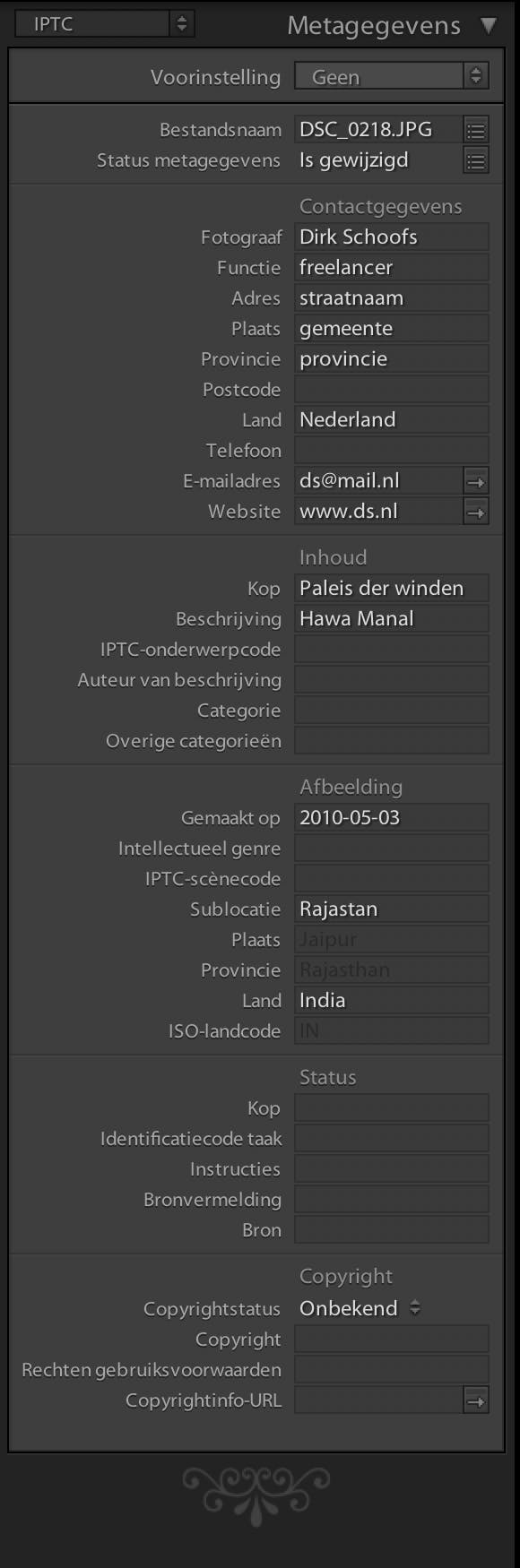 Naast de exif-gegevens maken ook de iptc-gegevens (international press telecommunications council) deel uit van de metadata. In tegenstelling tot exif geeft iptc geen technische maar inhoudelijke informatie over de foto. Denk hierbij aan de naam van de fotograaf, tref- en zoekwoorden waarop je de foto kunt terugvinden, enzovoort. Een aantal van deze iptc-gegevens kun je via je camera instellen, maar de meeste informatie voeg je later toe via specifieke software (bijvoorbeeld Adobe Camera Raw of Adobe Lightroom) of enkele interessante freeware tools.