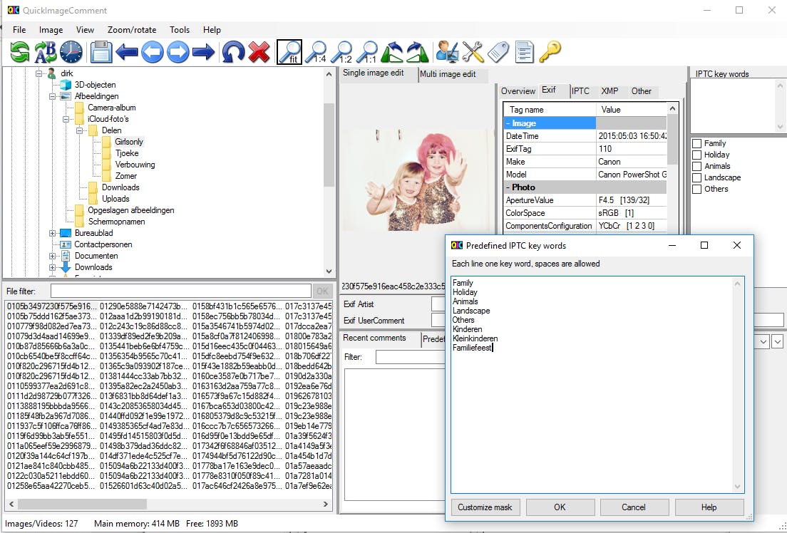 Wie aan zijn foto’s graag interne informatie toevoegt in de vorm van tags maar geen duur fotobeheerprogramma wil aanschaffen, kan de freeware QuickImageComment hier downloaden. Alle metadata komen snel in beeld, opgedeeld in vier kolommen: exif, iptc, xmp en others. Een aantal van deze metadata kun je rechtstreeks in het programma aanpassen. Zo is het mogelijk om iptc-sleutelwoorden toe te voegen, je kunt de auteursgegevens aanpassen, opmerkingen ingeven en de datum en tijd van opname wijzigen.