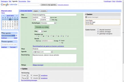 De kalenderdienst van Google wordt wereldwijd door duizenden mensen gebruikt. Dat heeft zo zijn redenen. De dienst is volledig gratis en beschikt over verschillende handige functies. Zo kunt u (een gedeelte van) uw kalender delen met vrienden, familieleden of collega's, waardoor het plannen van afspraken erg eenvoudig wordt. Bent u vaak onderweg? U kunt Google Calendar ook oproepen via uw mobiele telefoon. Bovendien kunt u uw online agenda synchroniseren met Microsoft Outlook of Apple iCal. Een offline versie opvragen, uw belangrijkste afspraken afdrukken of herinneringen instellen behoort eveneens tot de mogelijkheden. Afspraken die u via Gmail ontvangt, kunt u onmiddellijk vastleggen in Google Calendar.