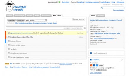 De takenlijst opnieuw uitgevonden dat is een prima omschrijving voor de online dienst Remember the Milk. Na een korte registratieprocedure kunt u uw takenlijstjes aanmaken. Deadlines, notities, trefwoorden, webpagina's, de geschatte tijd om de taak te voltooien of locaties toevoegen is een fluitje van een cent. Bent u nogal vergeetachtig? U kunt herinneringen ontvangen via e-mail of sms. Gebruiken uw vrienden of collega's Remember the Milk ook? Dan kunt u taken of takenlijsten delen. Het is zelfs mogelijk om uw account te koppelen aan Apple iCal of Google Calendar. Taken toevoegen via iPhone of Gmail kan eveneens. Handige tool voor iedereen met een uitgebreide takenlijst!