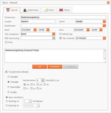Via de uitgebreide afsprakenmodus kunt u herhalingen instellen en bijlagen toevoegen.