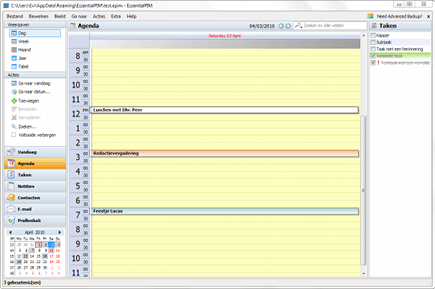Een agenda, een takenlijst, een notitieblok, een adresboek en een e-mailclient EssentialPIM Free bundelt deze functies in een overzichtelijk interface. Afspraken vastleggen, takenlijstjes maken, notities bewaren, het is allemaal even eenvoudig. Dankzij verschillende kleurrijke categorieën blijft uw agenda overzichtelijk, ook al staat hij bomvol. Wilt u overstappen van uw bestaande client? U kunt gegevens importeren uit Outlook (Express) en iCal. Wilt u uw gegevens delen? U kunt uw agenda exporteren naar html-, iCal-, txt- of rtf-formaat. Nog meer functies? De Pro-versie (29,95 euro) biedt onder meer een betere versleuteling en toegang tot meerdere mailaccounts.