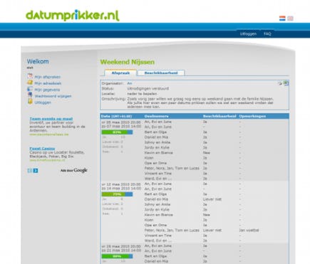 Wilt u een weekendje weg met enkele familieleden of vrienden? Organiseert u een barbecue of een reünie? Het zoeken naar een geschikte datum is niet altijd even gemakkelijk. Tenzij u Datumprikker gebruikt. Nadat u zich gratis geregistreerd hebt, kunt u uw afspraak een naam geven, een locatie toevoegen en een korte omschrijving invoeren. Vervolgens voert u enkele data in. Vul vervolgens nog even de e-mailadressen van uw genodigden in en verstuur de uitnodigingen. Elke ontvanger kan nu aangeven wanneer hij of haar beschikbaar is, en u ziet vervolgens welke datum het meest geschikt is voor uw feestje, vergadering of reünie. Het is zelfs mogelijk om de antwoorden te bewaren in een Excel-document. Handig!