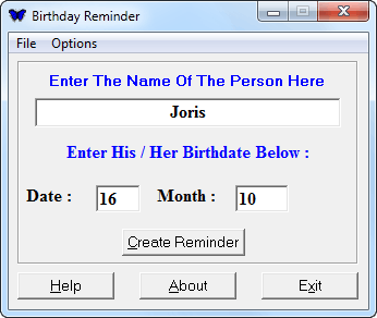 Vergeet u af en toe wel eens een verjaardag? Dankzij het eenvoudige programmaatje Birthday Reminder voorkomt u dat u de verjaardag van uw ouders, kinderen, partner, collega's of vrienden vergeet. Het enige wat u hoeft te doen is de voornaam (en eventueel ook achternaam) en de verjaardag eenmalig in te typen en op te slaan in Birthday Reminder. Het programma waarschuwt u dan op de dag zelf of één, twee of drie dagen van tevoren wanneer u de computer opstart. Meer doet het programma niet. U kunt via Birthday Reader wel nog een lijst opvragen van alle verjaardagen die u hebt ingevoerd.