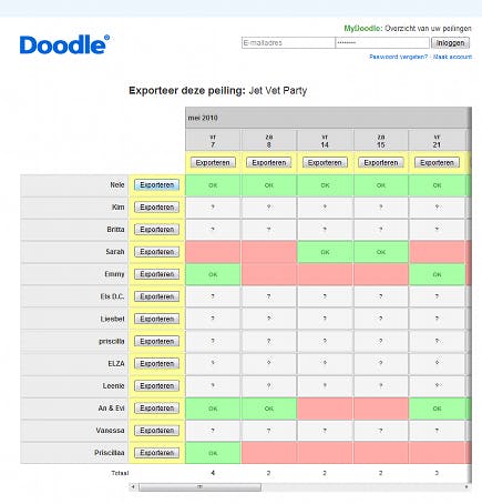 Net zoals Datumprikker is Doodle een erg handige activiteitenplanner. Nadat u een titel en omschrijving aan uw afspraak hebt gegeven kunt u verschillende data aanvinken. Indien gewenst kunt u ook tijdstippen toevoegen. Daarna hebt u de keuze om de uitnodigingen zelf te versturen (via een unieke url) maar u kunt Doodle de uitnodigingen ook laten versturen door simpelweg de e-mailadressen van uw ontvangers op te geven. Het is zelfs mogelijk om uw Google- of Outlook-adresbook aan Doodle te koppelen. Uw ontvangers kunnen aanvinken wanneer ze beschikbaar zijn en eventueel ook opmerkingen achterlaten. Verder kunt u instellen of alleen u of iedereen de antwoorden te zien krijgt.