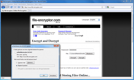 Lijkt het u nuttig om privacygevoelige bestanden te versleutelen alvorens u ze naar iemand doorstuurt? Surf dan naar de webdienst File-encrypter. U bedenkt een wachtwoord en selecteert een bestand op uw harde schijf. Zodra u op de knop Encrypt klikt, kunt u het beveiligde bestand met de extensie fe3 downloaden. Wilt u de data weer ontsleutelen? Typ het juiste wachtwoord en start het proces via de knop Decrypt. U beschikt nu weer over de originele gegevens.