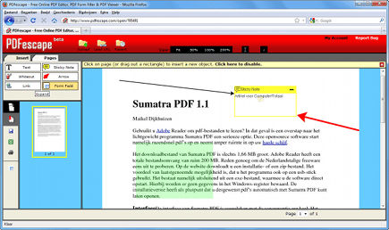 De website Pdfescape gebruikt u om online pdf-bestanden te lezen en eventueel aantekeningen toe te voegen. Het pdf-bestand in kwestie mag niet groter zijn dan 2 MB en maximaal vijftig pagina's bevatten. U plaatst onder andere notities, pijlen, teksten en hyperlinks in het document. Verder kunt u de pagina's en de volgorde aanpassen. Het bewerkte bestand downloadt u ten slotte naar de lokale pc.