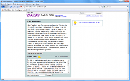 Bent u het Engels, Duits of Frans niet zo machtig? Laat automatisch teksten in het Nederlands vertalen met de website Babelfish.Yahoo. U kunt officieel maximaal 150 woorden tegelijk vertalen, maar de praktijk wijst anders uit: u kunt gerust langere stukken tekst gebruiken. Desgewenst vertaalt Babel Fish ook complete webpagina's. De woorden worden letterlijk omgezet naar het Nederlands, waardoor de zinsopbouw meestal te wensen overlaat.