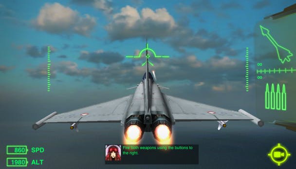 Na een korte introductie mag je zelf met het toestel aan de slag. Hopelijk beschik je over goede schietvaardigheden, want de multiplayer bestaat uit een luchtgevecht tegen een online vriend. Als alternatief kun je ook samen een straaljager besturen en andere straaljagers neerhalen.