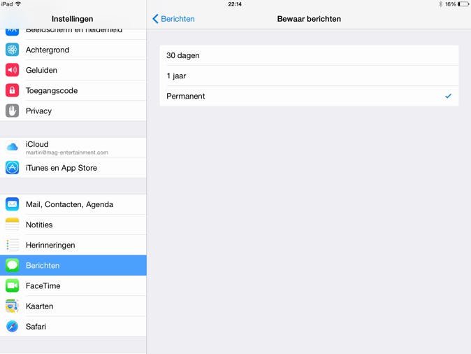 iMessage is superhandig, maar tenzij je onwijs georganiseerd bent en berichten regelmatig verwijdert, kan het al snel een bodemloze put voor opslagruimte worden. Dat kun je heel eenvoudig verhelpen. Navigeer naar Instellingen / Berichten / Berichtgeschiedenis en geef bij de optie Bewaar berichten aan dat berichten maximaal 30 dagen of 1 jaar bewaard mogen worden. Vervolgens kun je bij het kopje Audioberichten en Videoberichten ook nog aangeven dat audio- en videoberichten na een aantal minuten 'verlopen' en dus automatisch worden gewist. Dit voorkomt dat iMessage vol zit met gigabytes aan video en audio. Zorg dan wel even dat je filmpjes en audioberichten opslaat als je ze graag zou willen bewaren.