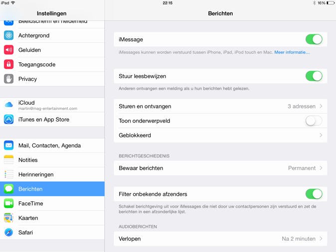 Iedereen kan je een iMessage-bericht sturen, het enige dat iemand daarvoor nodig heeft is je Apple ID (of, als je een iPad en iPhone aan hetzelfde Apple ID gekoppeld hebt, je telefoonnummer). Langzamerhand zien we ook steeds meer spam verschijnen in iMessage, hetzij van een commerciële partij of, zoals onlangs, van grapjassen die naar willekeurige mensen een specifiek stuk code stuurden dat elk iOS-apparaat deed crashen. Gelukkig is het mogelijk om dit soort berichten te filteren uit je Berichtgeving. Navigeer naar Instellingen / Berichten en zoek het kopje Filter onbekende afzenders. Wanneer je deze optie inschakelt, worden berichten van mensen die niet in je lijst met contactpersonen staan, niet via een notificatie getoond en worden ze ook niet in de reguliere lijst met berichten weergegeven.