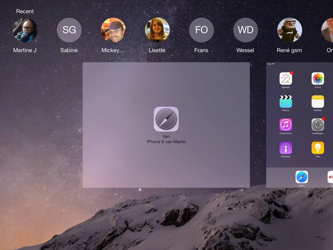 In dit artikel lees je hoe je Handoff precies werkend krijgt. Daarin staat dat je een app kunt 'overnemen' van je andere iOS-apparaat, door in het stand-by-scherm op het pictogram linksonder te drukken. Maar hoe zit het als je de iPad al actief is? Moet je de tablet dan eerst op stand-by zetten? Gelukkig niet, dat zou wat omslachtig zijn. Om Handoff te gebruiken wanneer de iPad al actief is, druk je tweemaal op de Thuisknop om de multitask-balk tevoorschijn te toveren. Vervolgens veeg je met je vinger naar rechts totdat je helemaal aan de linkerkant het pictogram voor Handoff ziet. Zo kun je de app dus ook overnemen.