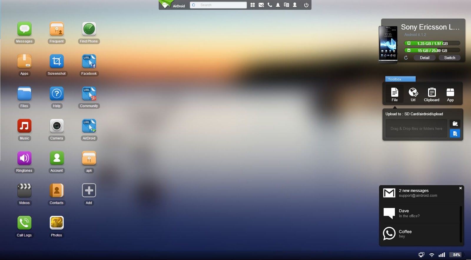 Een gave manier om je Android te besturen via je pc (of een ander apparaat, zolang er maar een browser en internetverbinding is) is AirDroid. Zodra je de app installeert en verbinding maakt, kun je je Android vanaf je pc bedienen via de browser. Handig, bijvoorbeeld als je op je werk bent. Zo kun je namelijk gewoon je Android blijven gebruiken terwijl je werkt. Maar ook als je toestel fysiek ergens anders is, kun je hem benaderen. Je toestel wordt als een desktop gepresenteerd en je kunt meteen reageren op berichten en telefoontjes. Ook kun je bestanden over en weer sturen. De betaalde versie maakt het zelfs mogelijk de camera te bedienen, waardoor je eigenlijk een draadloze beveiligingscamera hebt.