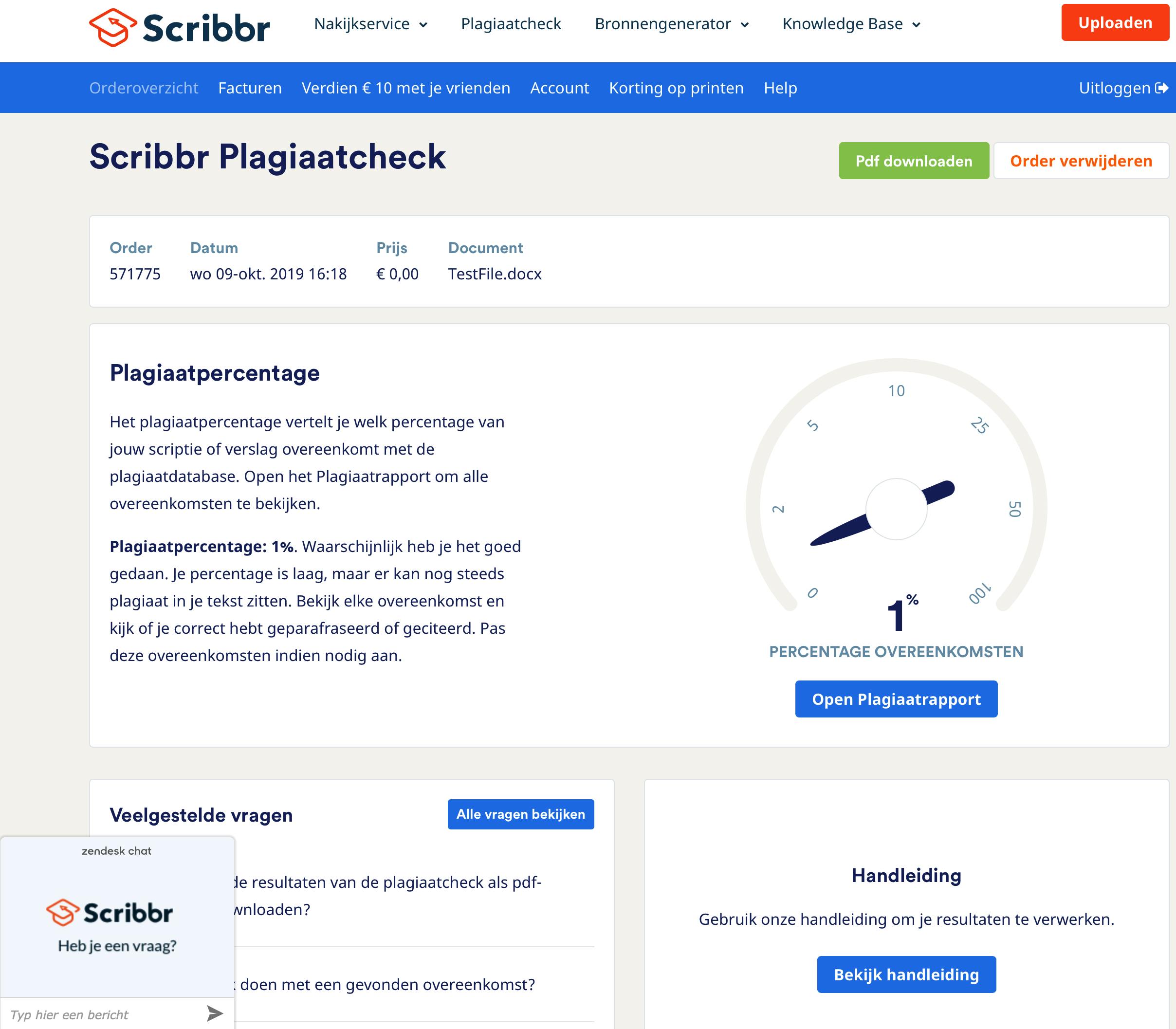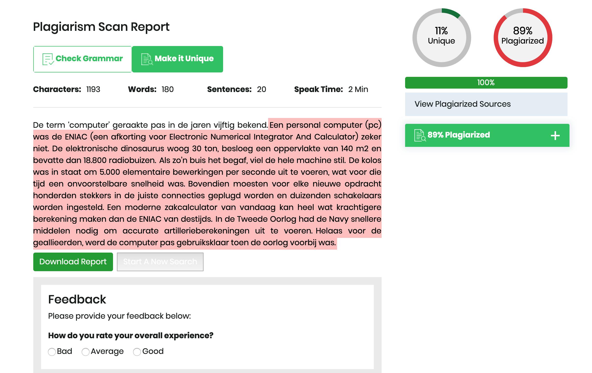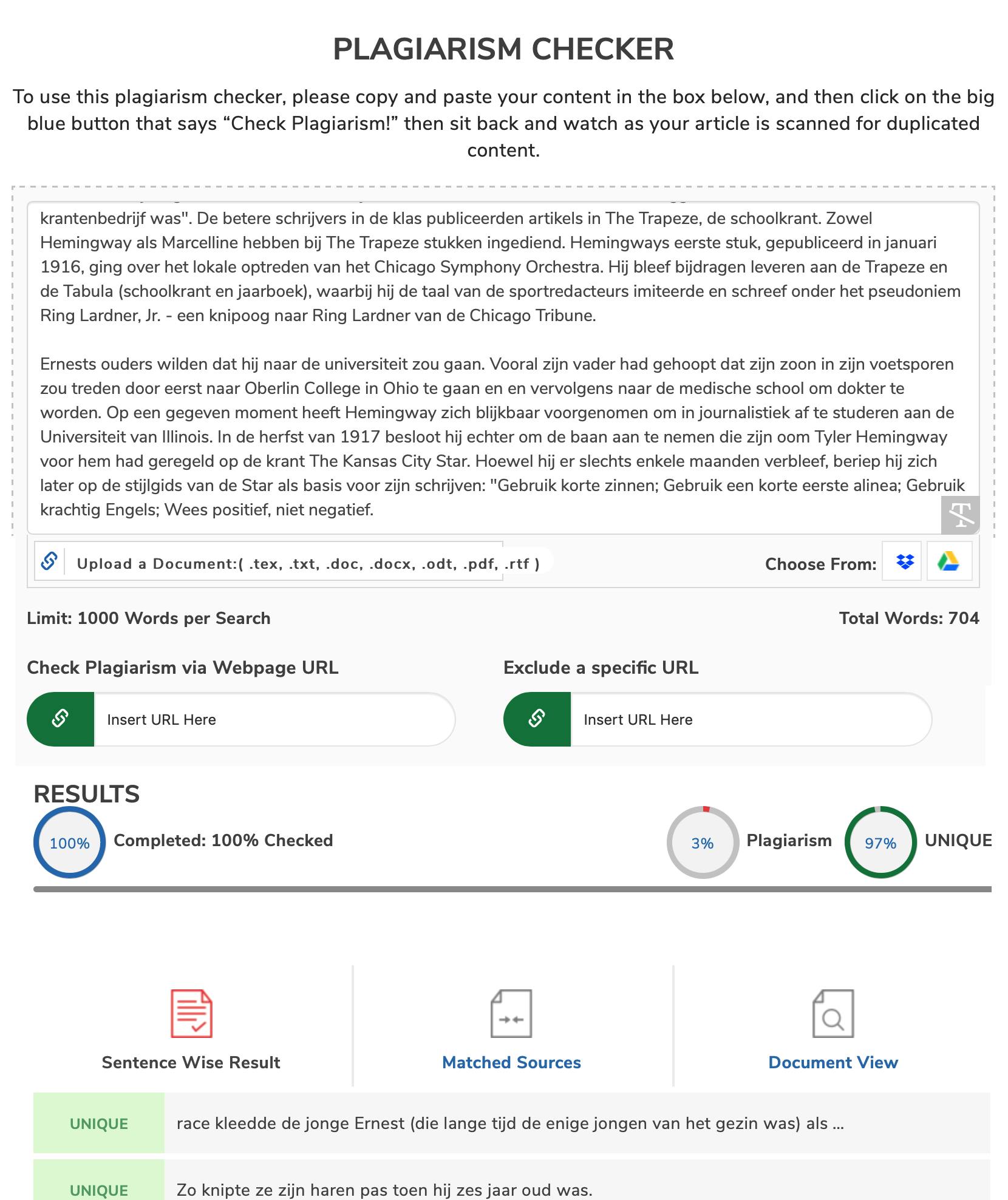 Plagiarism Detector deed het bij ons dan weer veel beter en werkte ook met Nederlandse tekst. Ook hier kun je maximaal 1.000 woorden per keer laten nakijken. Het resultaat bevat een percentage dat uniek is en dus ook hoeveel plagiaat deze tool signaleert. Bij Plagiarism Detector werkt de tool om uploads te controleren wel, zolang het txt-, Word- of pdf-document de maximumlengte maar niet overschrijdt.