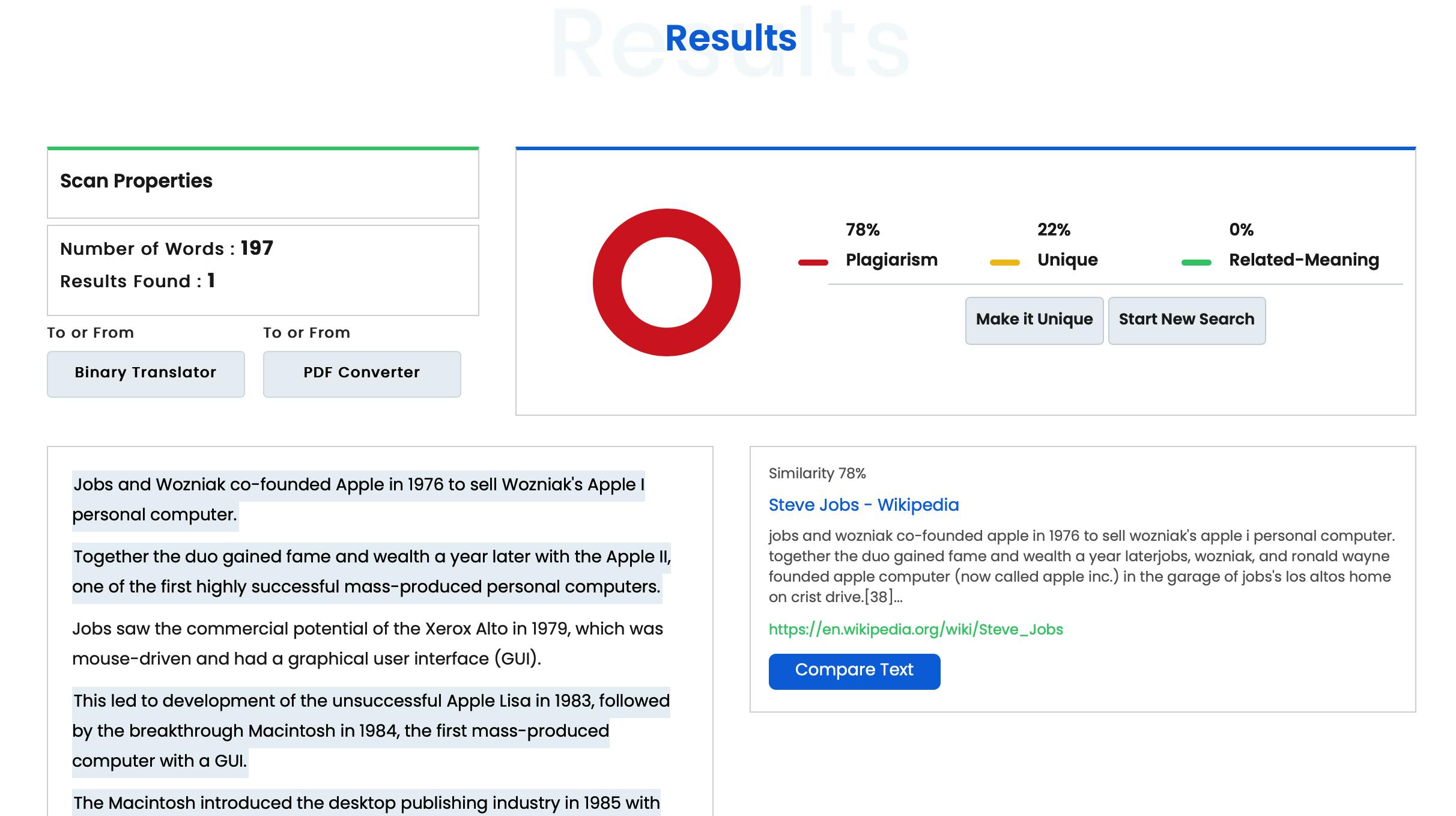Met de gratis plagiaatcheckers ondervinden we vaak moeilijkheden. Soms werkt het script van de documenten-uploader niet, of vindt de tool geen gelijkenis wanneer we het bestand uploaden, maar als we de tekst gewoon plakken wel. Neem bijvoorbeeld Dupli Checker, een service die op het web wordt getipt als goede gratis checker. Deze dienst vond geen enkele gelijkenis wanneer we een Nederlandse tekst lieten controleren. Plakten we het Engelse equivalent daarvan, dan detecteerde hij 78% plagiaat, terwijl we de tekst eigenlijk volledig gekopieerd hadden van een bekende website.