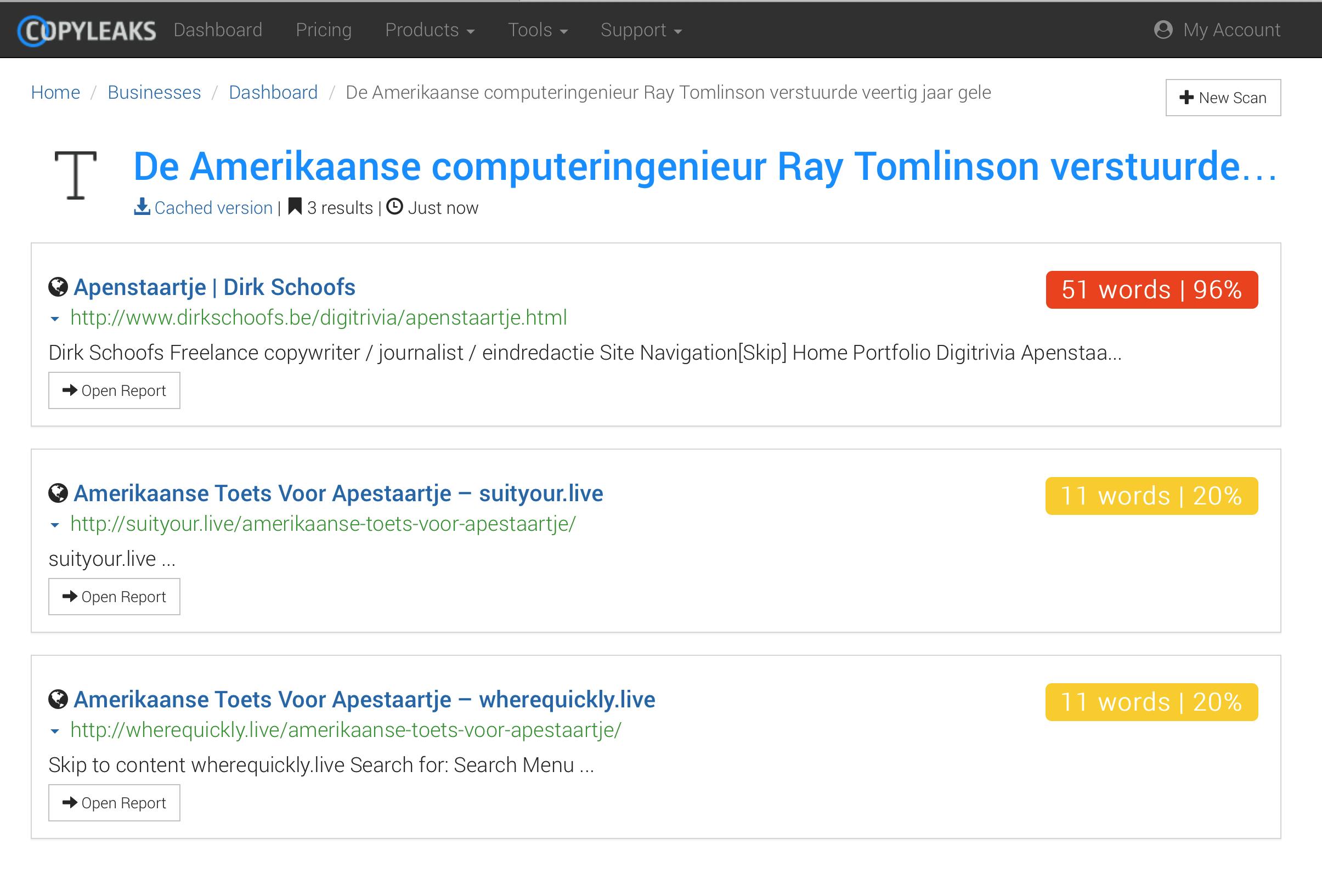Aan gratis online plagiaatcheckers is geen gebrek. Wel zijn ze allemaal beperkt in het tekstvolume dat je kunt laten checken. Plagiarism Checker van Small SEO Tools is beperkt tot 1.000 woorden per keer. Een tekst kun je in het tekstvak plakken, je kunt het document uploaden van je harde schijf, Dropbox of Google Drive, of je kunt een url van de webpagina die je tegen het licht wil houden invoeren. Enkele seconden later zie je hoeveel procent van de tekst verdacht lijkt. Zo’n passage verschijnt in het rood met een link. Als je daarop klikt, kom je erachter dat deze tool Google gebruikt om de verdachte zinnen te detecteren in andere webbronnen.