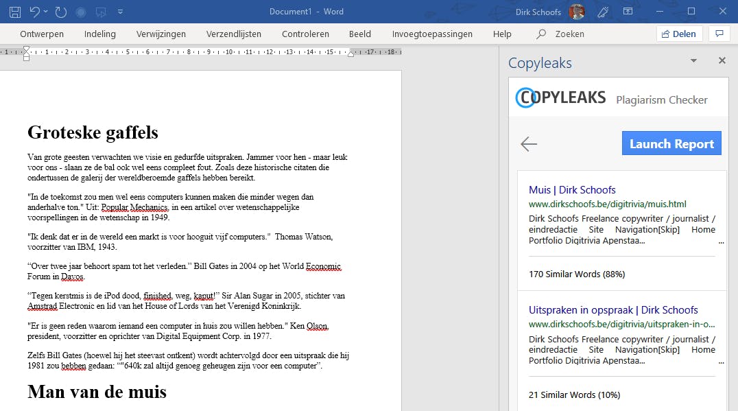 De add-on van Copyleaks voor Microsoft Word, is een echte uitkomst. Op de website van Copyleaks navigeer je in het menu naar Tools. Na de installatie van de add-on zie je in het lint bij het tabblad Verwijzingen de knop Scan. Als je hierop klikt, opent zich aan de rechterkant een balk zodat je bij Copyleaks kunt inloggen. Enkele seconden later krijg je daar een minirapport te zien. Via de knop Launch Report opent een webpagina met een gedetailleerd verslag. Mocht je de add-on beu zijn, klik er dan met de rechtermuisknop op en kies voor Invoegtoepassing verwijderen.