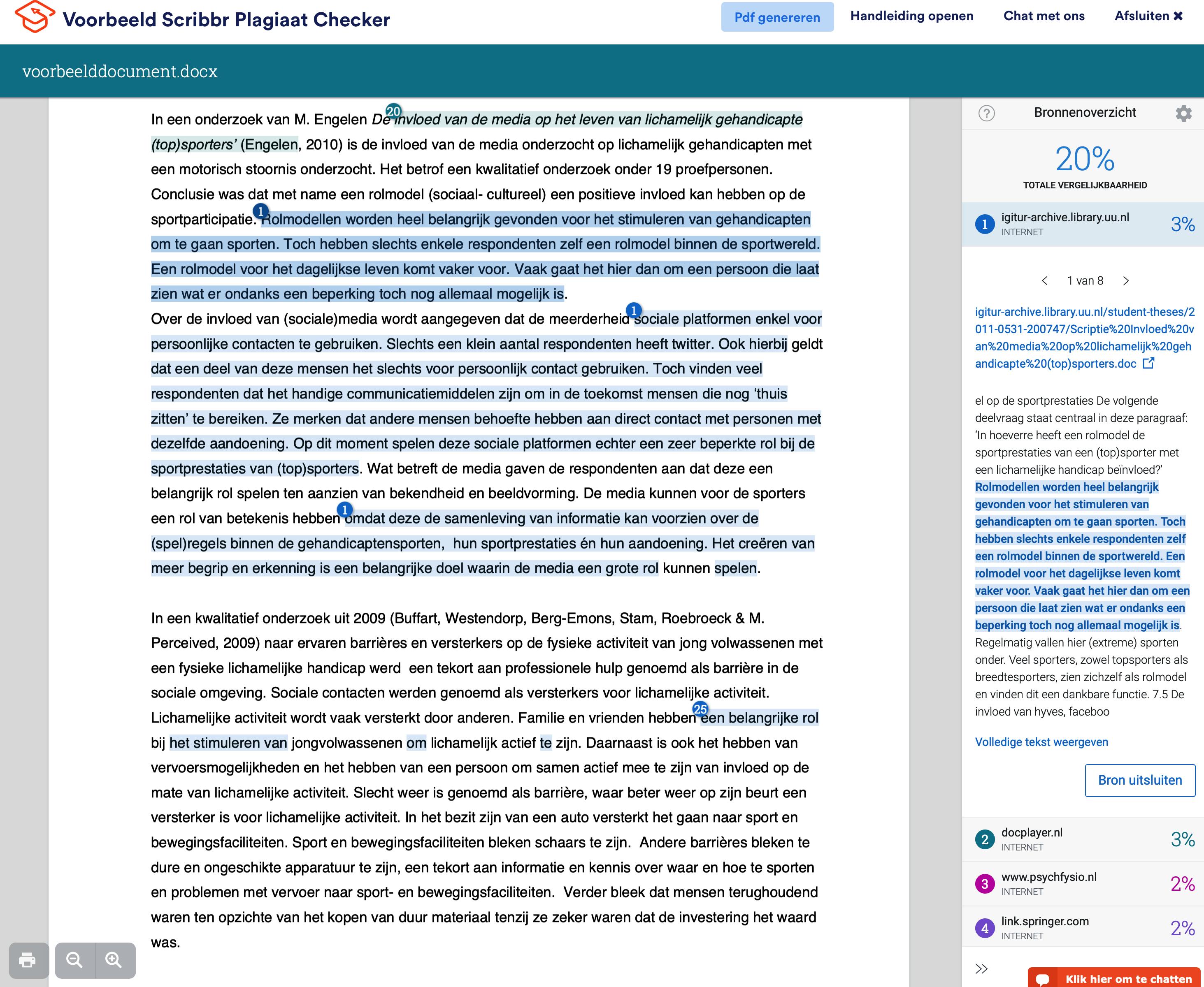 We testen Scribbr met een paper van een filosofiestudent. Ben je ingelogd bij Scribbr, dan kun je het document of laten nakijken door een redacteur van vlees en bloed op stijl, taal en structuur of je kiest voor de online plagiaatcheck. Nadat je het pdf-, doc- of docx-document hebt geüpload, zie je hoeveel de check je zal kosten. Het rapport geeft aan dat onze tekst een vergelijkbaarheid van 20% haalt. Aan de rechterkant kun je aflezen met welke bron de gemarkeerde tekst wordt vergeleken. We merken dat Scribbr erg streng is. Van de vier meldingen is geen enkele melding echt plagiaat. Je kunt iedere melding apart uitschakelen met de knop Bron uitsluiten.