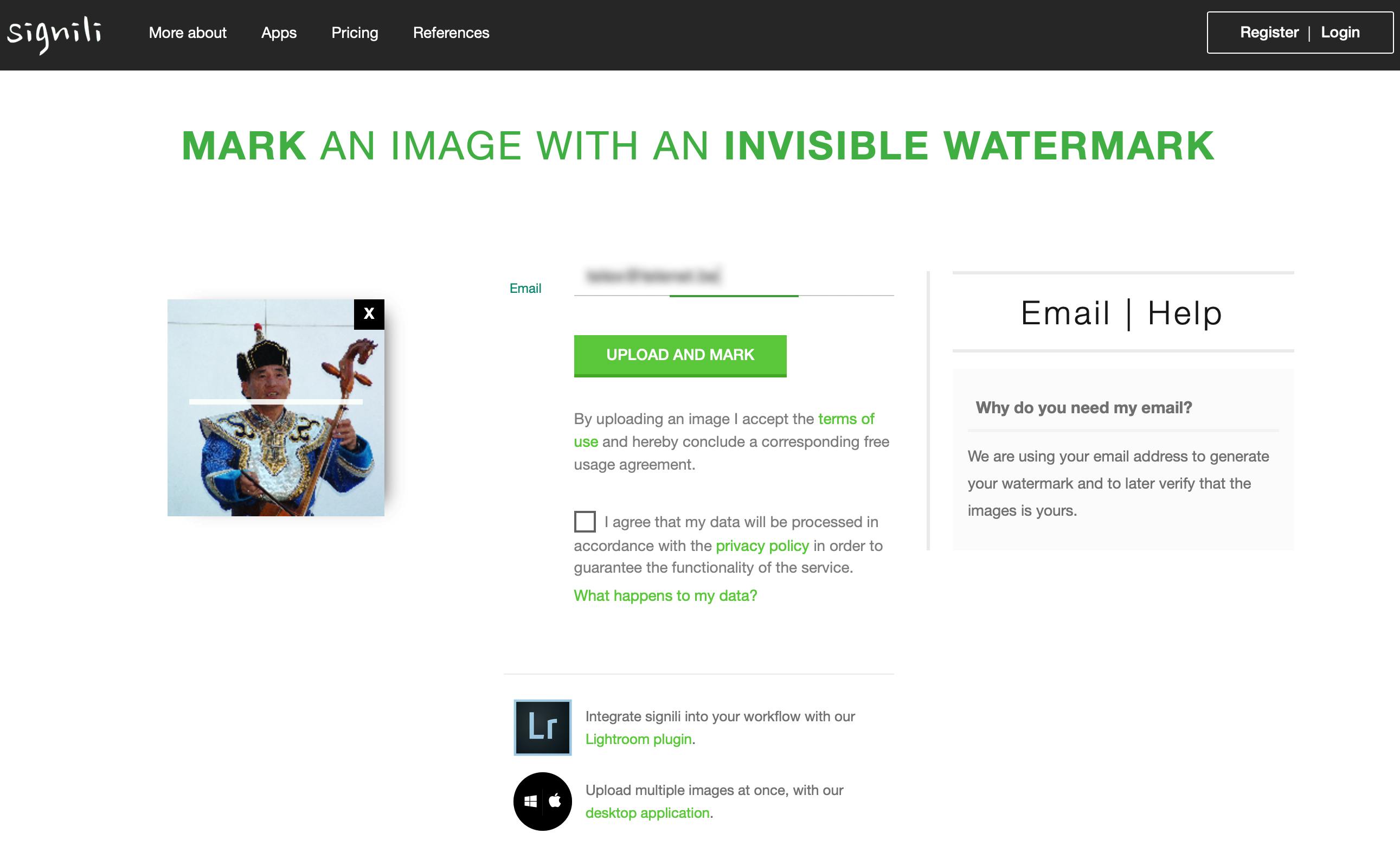 Voor amateur- en professionele fotografen bestaan er diensten die hun foto’s beschermen tegen misbruik. Signili voegt zowel een onzichtbaar watermerk aan je foto’s toe als dat het een zoekmachine is die volgt waar je gemarkeerde foto’s worden gepubliceerd. In de gratis versie mag je twintig watermerken per drie maanden aanbrengen. Is dat onvoldoende, dan stijgt de prijs naar 9,99 euro voor het toevoegen van vijftig watermerken aan je foto’s. De foto’s met watermerk worden op je harde schijf en op de Signili-servers opgeslagen zodat je werk getraceerd kan worden. Je kunt Signili gebruiken als webapplicatie, desktop-app en als plug-in voor Lightroom.