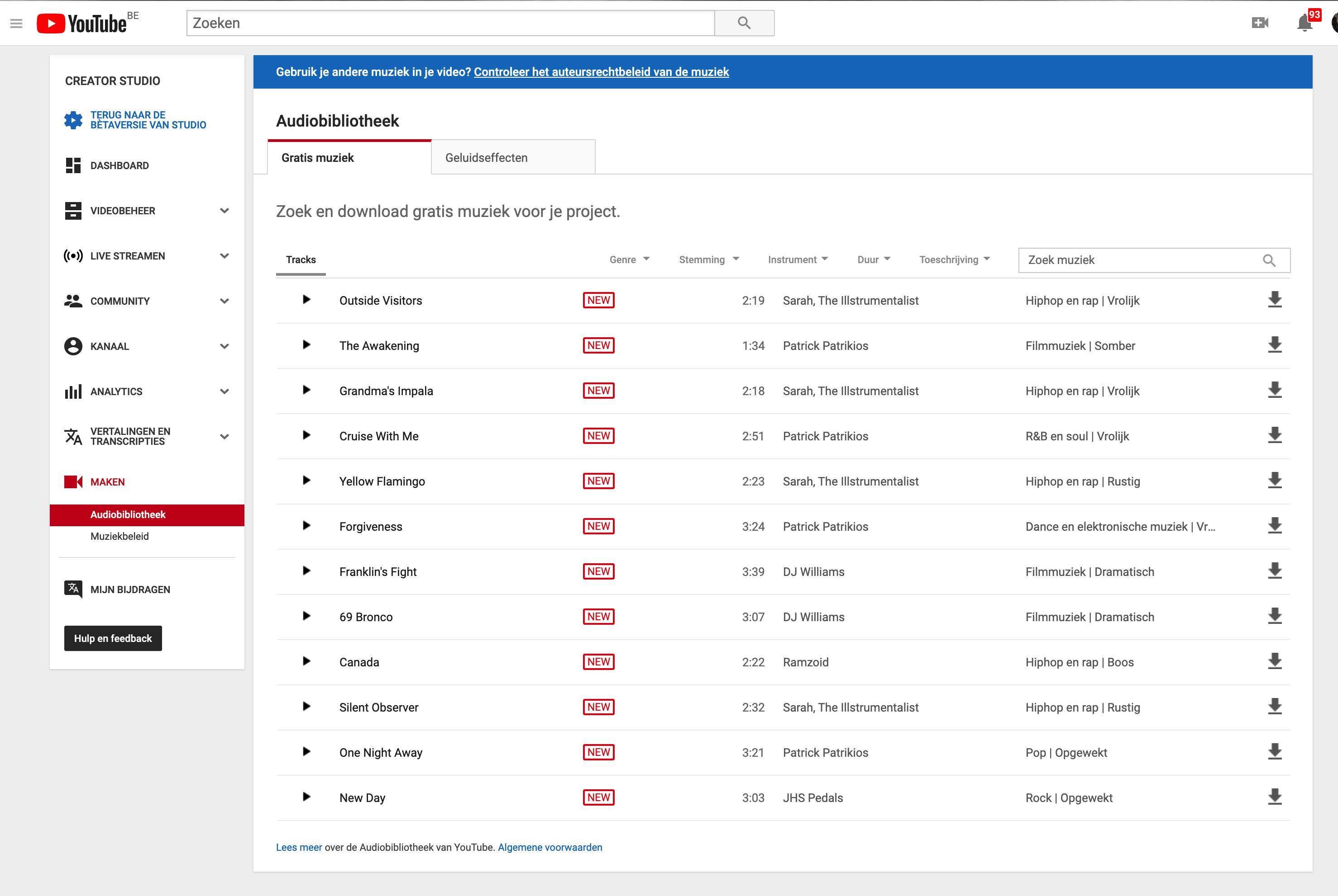 Bepaalde platenlabels en artiesten dienen om het minste of geringste een copyrightclaim in. Daarom heeft YouTube laatst een aanpassing in de regels aangebracht om ‘agressief handmatig claimen’ tegen te gaan. YouTube merkte namelijk dat er de laatste maanden veel copyrightclaims binnenkwamen voor korte muziekfragmenten die op de achtergrond afspeelden. Denk bijvoorbeeld aan een filmpje waarbij een auto voorbijrijdt waaruit muziek klinkt. Voortaan kunnen platenlabels geen inkomsten meer verdienen aan dergelijke korte muziekfragmenten. Trouwens, in Creator Studio van YouTube vind je in de sectie Maken een uitgebreide selectie aan audio die je vrij mag gebruiken.
