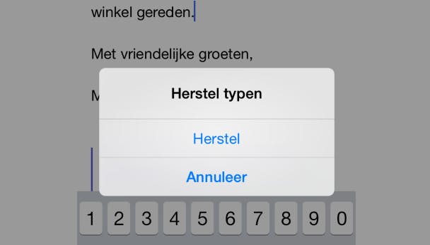 Als je tijdens het typen of plakken een foutje hebt gemaakt, keer je wellicht graag weer terug naar de oude situatie. Je kunt natuurlijk de tekst weghalen door meermaals op de Backspace-toets te drukken, maar erg handig werkt dat niet. Efficiënter is door je iPhone kort en krachtig te schudden. Hiermee herstel je namelijk de laatste handeling. Probeer het maar eens uit nadat je een tekst hebt getypt. Schud daarna je iPhone en kies voor Herstel.