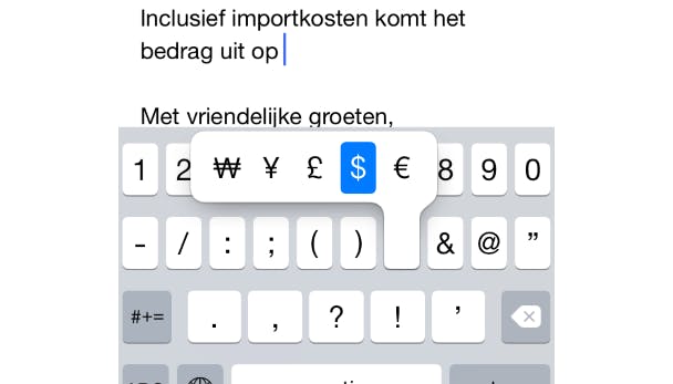 In het toetsenbord van je iPhone zijn allemaal extra karakters verstopt. Hierdoor kun je bijvoorbeeld meer valutasymbolen en klinkers met een umlaut gebruiken. Open het toetsenbord. Wil je bijvoorbeeld het karakter ë graag toevoegen, dan houd je de letter E enige tijd ingedrukt. Er verschijnt een pop-upvenster waarin je het gewenste karakter kunt kiezen. Beweeg je vinger naar rechts totdat het juiste karakter is geselecteerd. Laat het scherm vervolgens weer los. Extra valutasymbolen voeg je toe door het symbool € ingedrukt te houden.