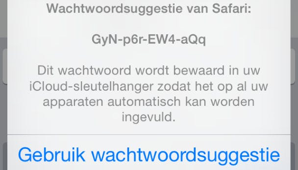 Je iPhone is in staat om nieuwe wachtwoorden te genereren. Schakel eerst iCloud Sleutelhanger in door naar Instellingen / iCloud te navigeren. Log in met je Apple ID en verzin een viercijferige pincode. Je voegt voor de veiligheid daarna een telefoonnummer toe, waarna je bevestigt met Volgende. Open Safari en creëer bij een webdienst een nieuw account. Tik het wachtwoordveld aan en kies voor Suggestie voor wachtwoord / Gebruik wachtwoordsuggestie.