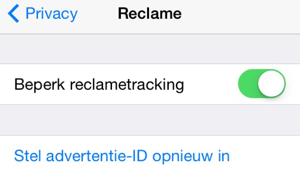 Heb je liever niet dat adverteerders je surfgedrag volgen? Ga dan naar Instellingen / Privacy / Reclame en schakel de optie Beperk reclametracking in. Via Stel advertentie-ID opnieuw / Stel opnieuw in verwijder je opgeslagen data over je surfgedrag van het toestel. Na het activeren van deze instelling verschijnt er overigens nog steeds reclame in beeld. De advertenties zijn nu echter niet meer gebaseerd op jouw interesses.