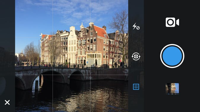 We zijn gewend om het onderwerp exact in het midden te zetten. Plaats je het meer naar de zijkant, dan blijkt een foto vaak veel interessanter om naar te kijken. Verder plaats je een horizon bij voorkeur op een derde vanaf boven. Als het om de mooie wolkenlucht gaat, dan zet je hem juist op een derde van onderen. Is er een mooie reflectie te zien, dan krijg je symmetrie met een horizon in het midden. Tijdens het fotograferen met de Instagram-app kun je een raster aanzetten via het blauwe raster-pictogram naast de voorbeeldweergave. Dat helpt enorm om mooiere composities te maken. De hulplijnen zitten precies op een derde van het beeld.