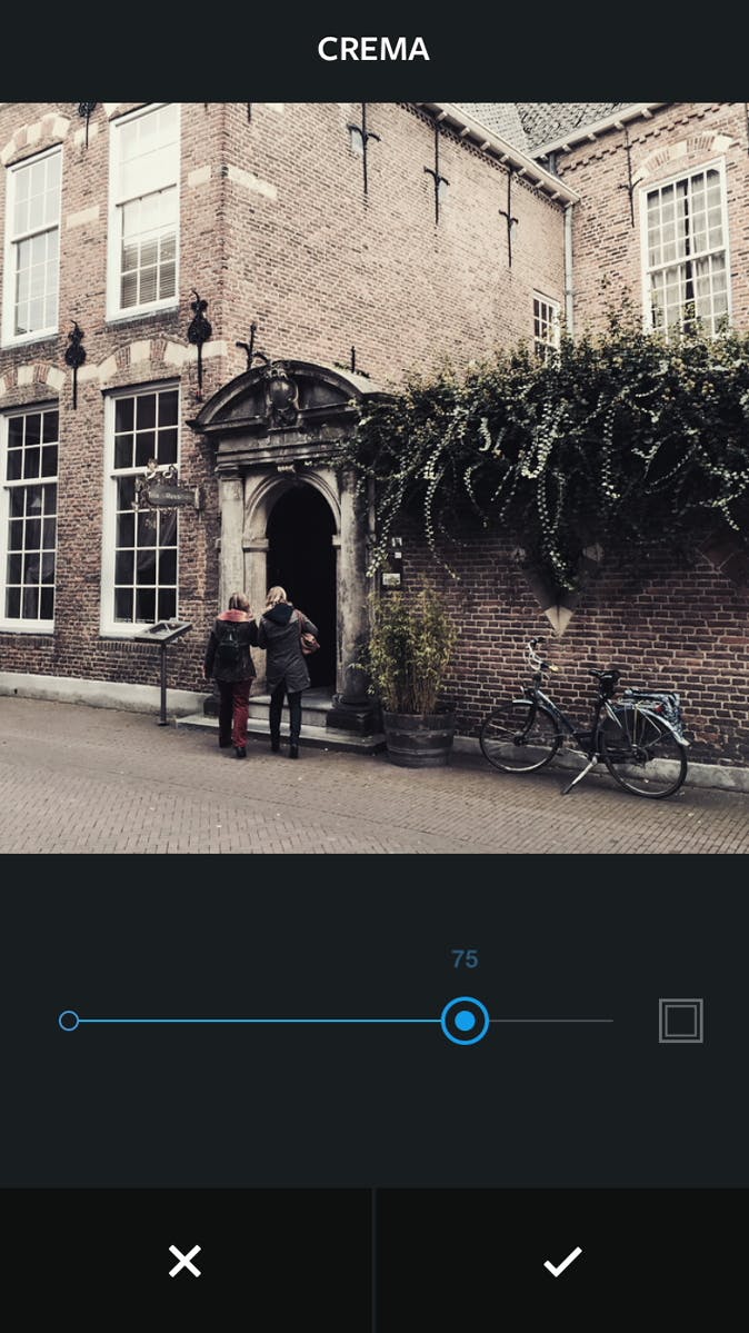 Zodra een foto is genomen of uitgekozen selecteer je een filter. Je kunt ze stuk voor stuk aflopen tot je het mooiste effect hebt. Tik twee keer op hetzelfde filter en er verschijnt een schuifregelaar waarmee je de sterkte instelt. Met het vierkantje naast de regelaar voeg je een kader toe.