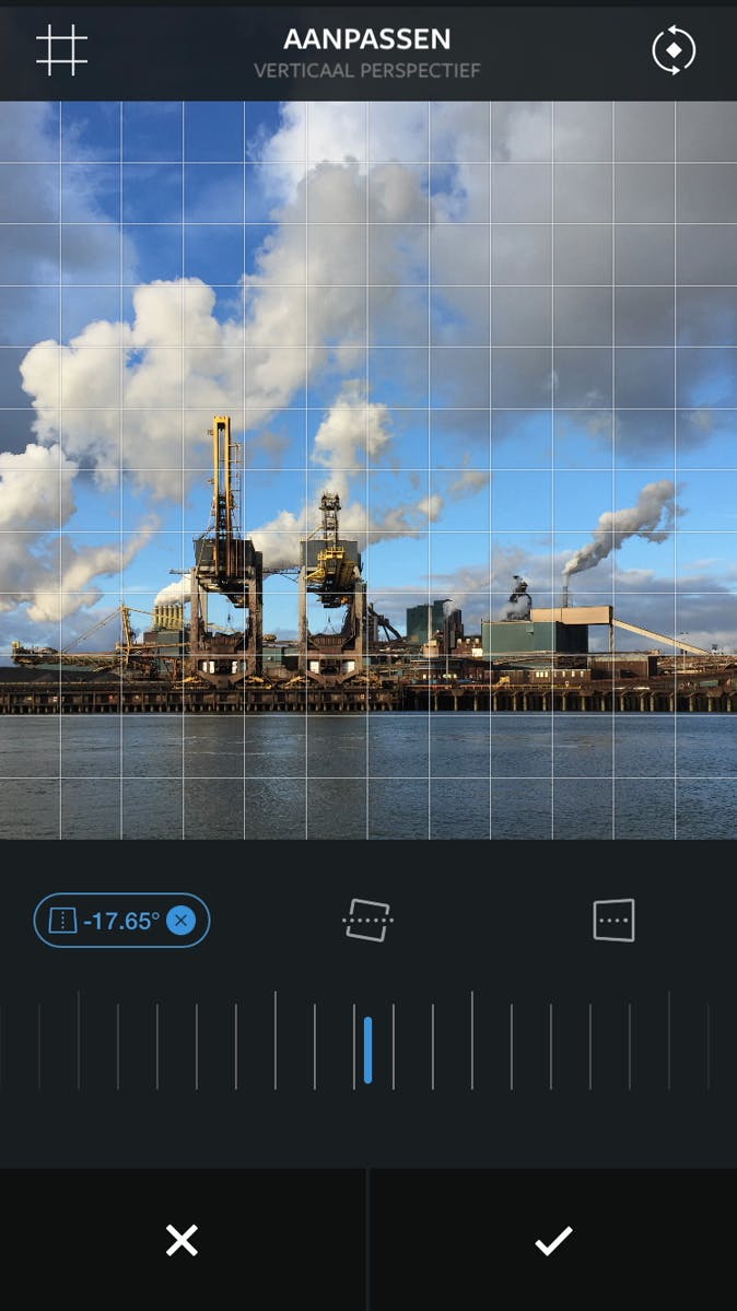 Er zijn drie slimme bewerkingen die we apart noemen. Met Vignette voeg je donkere hoeken toe. Hierdoor gaat de aandacht van de kijker vanzelf naar het lichtere midden. Met Tilt shift vervaag je een foto deels, zodat het lijkt of je een miniatuurwereld hebt vastgelegd. Via Aanpassen zet je een scheve foto netjes recht. Daarnaast kun je het perspectief corrigeren. Staat een gebouw scheef of lijkt het achterover te vallen? Dan heb je de telefoon niet exact recht naar voren gericht. Kies boven het draaiwiel voor Verticaal perspectief of Horizontaal perspectief en in een mum van tijd zet je alles kaarsrecht. Fantastisch! Linksboven in beeld kun je nog drie varianten van rasterlijnen aanzetten om je bij deze klus te helpen.