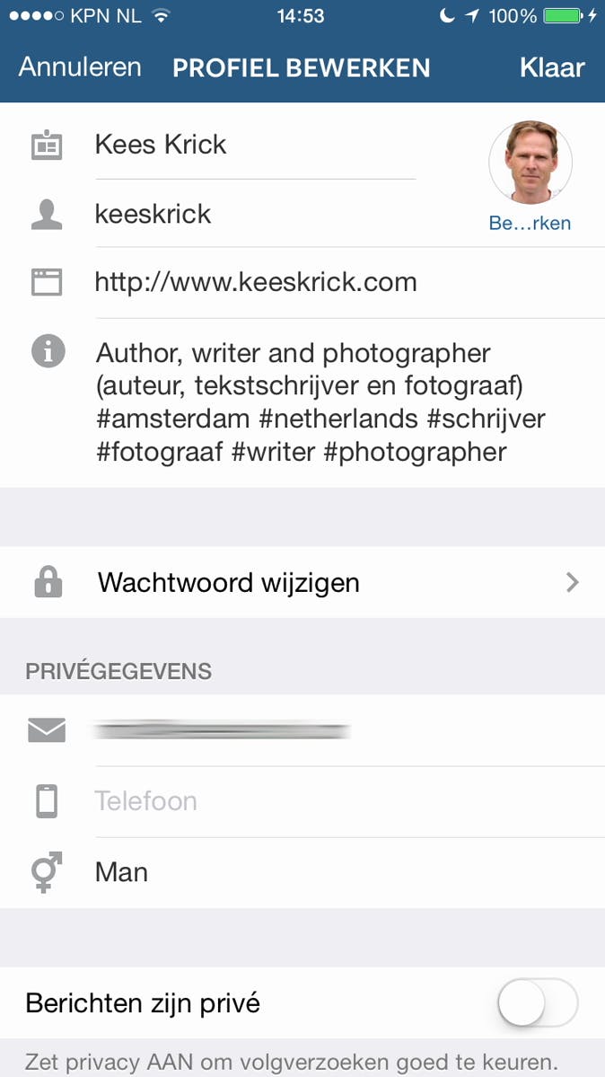 Tik je op het hoofdscherm van Instagram rechtsonder op het poppetje, dan zie je alle foto's die jij op Instagram hebt geplaatst. Ook is jouw profiel hier te zien. Een duidelijk profiel geeft anderen inzicht in wat ze kunnen verwachten als ze jou gaan volgen. Tik daarom op Je profiel bewerken en geef in de omschrijving aan wie je bent of wat voor soort foto's je zoal plaatst. Richt jij je op een internationaal publiek, dan schrijf je dit het liefst in het Engels. Wil je niet dat zomaar iedereen je foto's ziet, maar alleen door jou goedgekeurde volgers? Schakel dan Berichten zijn privé in.