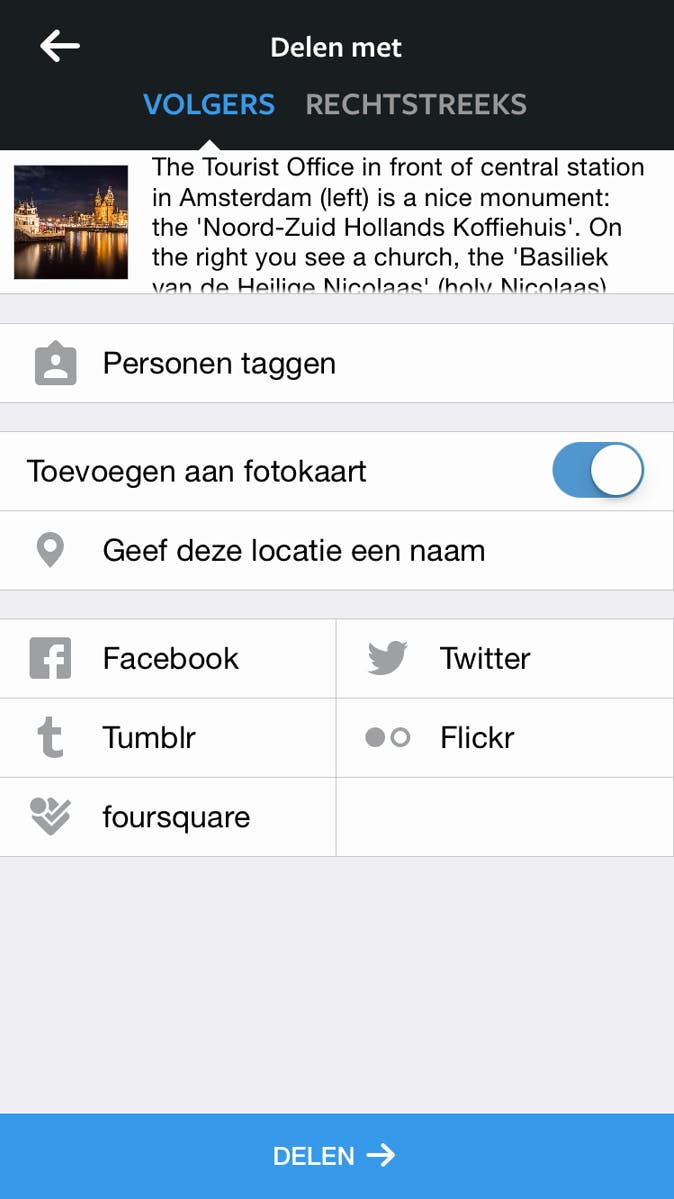 Deel je foto's die gemaakt zijn met je smartphone? Dan zitten er vrijwel zeker locatiegegevens in. Perfect als je de Eiffeltoren of Euromast op de plaat zet, maar wat als je thuis foto's maakt? Wil je dat iedereen weet waar jij woont? Op het scherm Delen met waar je de foto-omschrijving en hashtags intikt (zie tip 8), kun je Toevoegen aan fotokaart uitzetten om dit te voorkomen. Wil je wel locatiegegevens gebruiken en er meteen een leuke naam aangeven omdat je er vaker fotografeert, dan tik je dit in bij Geef deze locatie een naam.