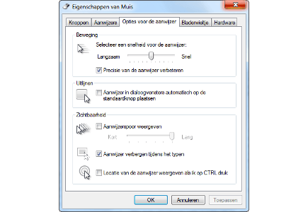 Het kan gebeuren dat u op uw pc aan het werk bent en de muisaanwijzer voortdurend kwijt bent, of dat de muisaanwijzer zó traag beweegt dat het werken u onmogelijk wordt ge-maakt. In dat geval zijn de instellingen van uw muis waarschijnlijk door iemand aangepast. U kunt dit herstellen door naar Start / Configuratiescherm / Muis te gaan. Klik op het tabblad Opties voor de aanwijzer en versleep de schuifregelaar zó dat de muis de gewenste snelheid heeft. Door op het tabblad Knoppen te klikken, kunt u ook nog aangeven hoe snel er tweemaal achter elkaar met uw muisknop moet worden geklikt om uw actie als dubbelklik te laten tellen. Klik op OK, waarna uw muis weer met de door u gewenste snelheid werkt.