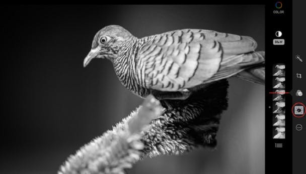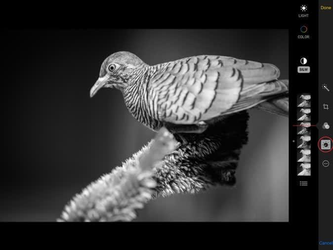 In Photos voor iOS 8 selecteer je een foto en druk je op Edit. Druk vervolgens op het Smart Adjustments-icoon (het lijkt op een kilometerteller). Druk op B&W en sleep de rode balk die verschijnt omhoog of omlaag over de voorbeelden totdat je tevreden bent met het contrast.