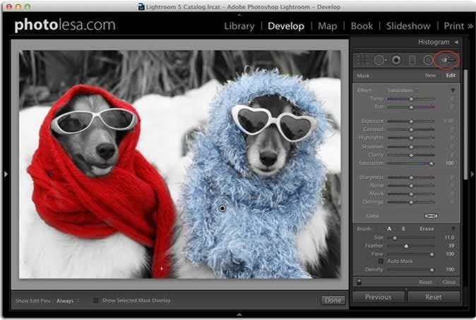 In Lightroom druk je op D om de Develop-module binnen te gaan en klik je in het HSL/Color/B&W-paneel op Saturation. Sleep alle schuifbalken helemaal naar links om de verzadiging van de afbeelding te verminderen. Activeer de Adjustments Brush en klik naast het woord Mask op New. Sleep de Saturation-schuifbalk helemaal naar rechts, verplaats de Flow-schuifbalk naar 100% en verf over de gebieden die je gekleurd wil houden. Als je teveel kleur onthult, verf dan terwijl je de Option-toets ingedrukt houdt over die gebieden om de verzadiging weer te verminderen.