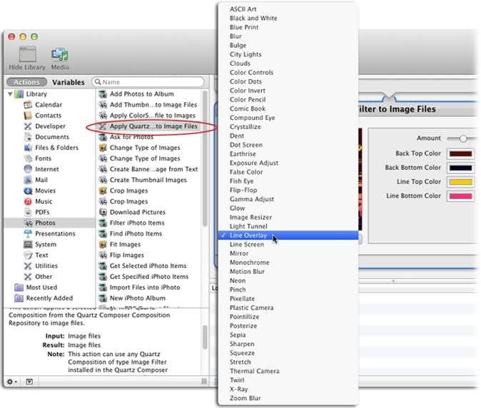 Je kan leuke effect maken met Automator's Apply Quartz Composition Filter.