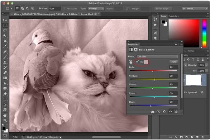 In Photoshop klik je op de half zwarte, half witte cirkel onderaan het Layers-paneel en kies je Black & White. In het Properties-paneel dat verschijnt schakel je Tint in en klik je op de rechthoek ernaast. In de Color Picker gebruik je de verticale balk om een reeks kleuren te kiezen en klik je binnen de grote rechthoek om Photoshop te vertellen hoe licht of donker je de kleur wil hebben. Terug in het Layers-paneel kun je de doorzichtigheid van de zwart-witte laag aanpassen om het effect te verfijnen.