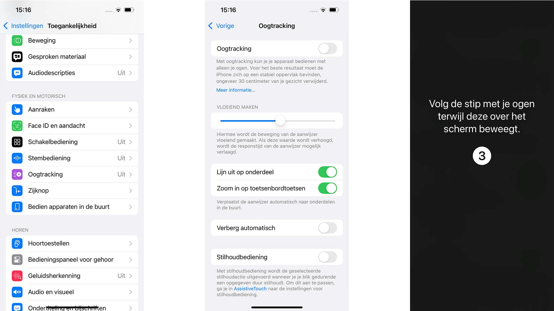 Deze functie werd iets eerder geïntroduceerd, maar is dus ook beschikbaar met versie 18.2 en 18.3: oogtracking. Dat is eveneens een toegankelijkheidsoptie, en hiermee kun je de iPhone met je ogen bedienen. Superhandig voor mensen die minder met hun handen kunnen doen. Je hebt hiervoor wel minimaal een iPhone SE 3 of iPhone 12 nodig. Door de onderstaande stappen op te volgen, activeer je de oogbediening.