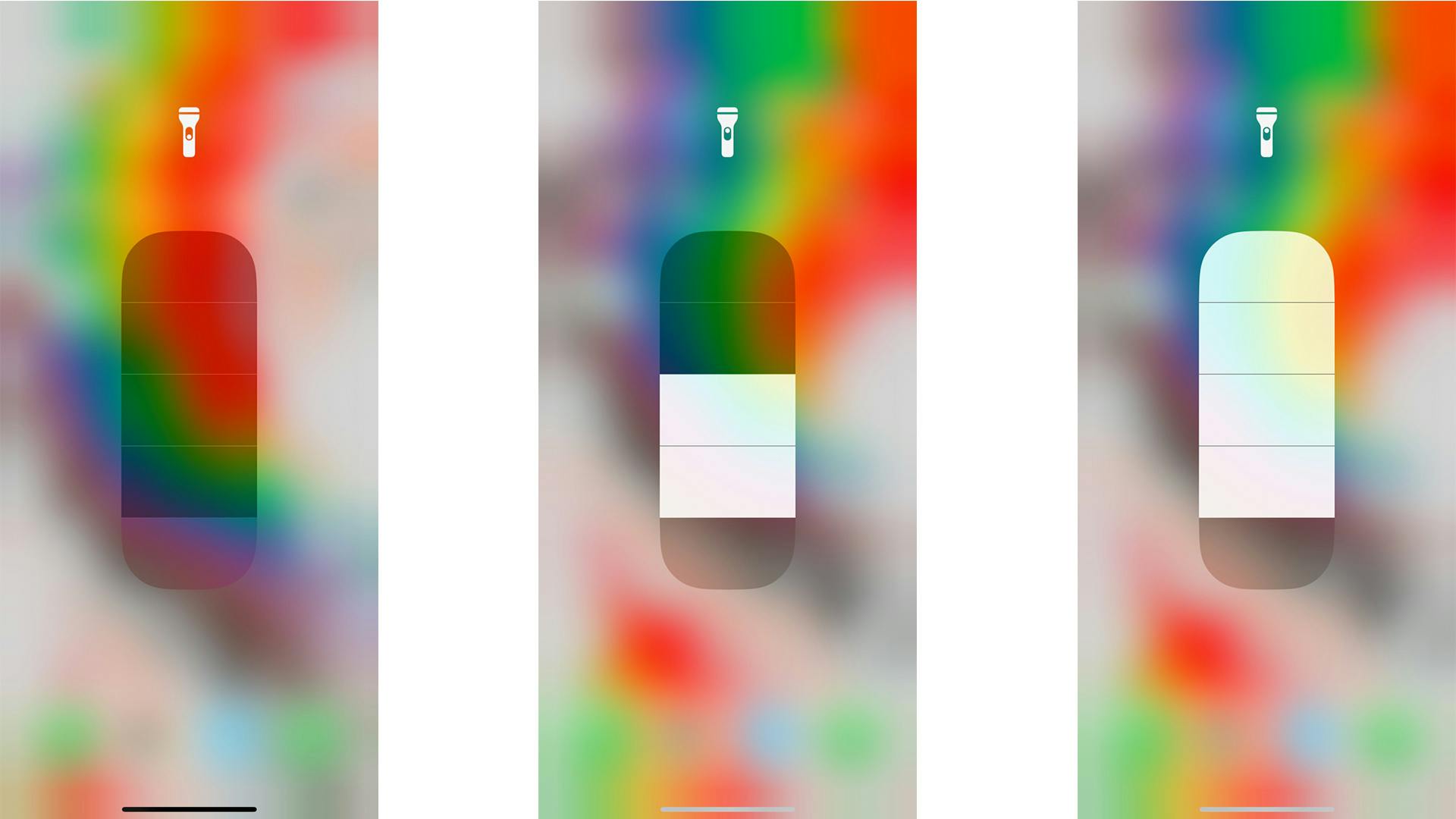 - Op moderne iPhones zie je nu een zaklamp in beeld komen. Hier kun je naar links en naar rechts vegen om de breedte aan te passen. Als je nu omhoog of omlaag veegt, pas je de helderheid aan. Op oudere iPhones werkt dat net even anders. Dan zie je een gelaagde balk in beeld staan. Door op de verschillende lagen te tikken, pas je aan hoe fel het licht is.