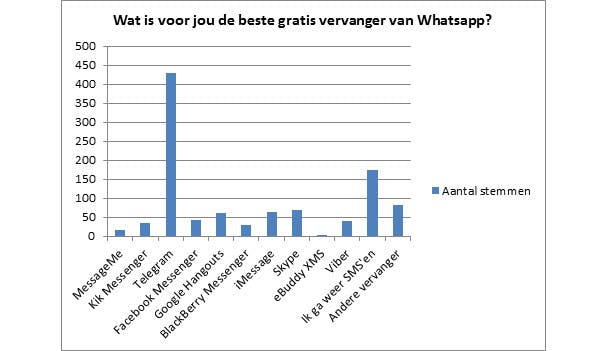 WhatsApp lag de afgelopen weken flink onder vuur. Vooral de overname door Facebook en een langdurige storing was voor veel gebruikers reden om op zoek te gaan naar een alternatieve berichtendienst. Van de ruim duizend respondenten geeft 40,9 procent aan Telegram als de beste vervanger te zien.