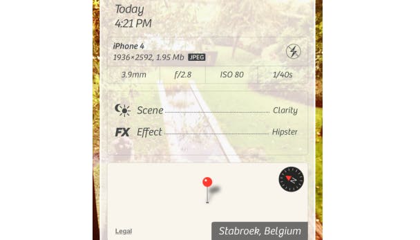 In de Lightbox van Camera+ (iOS) kun je de info van iedere foto opvragen. Daar verschijnt niet alleen de ISO-waarde, brandpuntsafstand, sluitertijd en het diafragma, maar ook de opnamelocatie in een kaartje. Deze gps-gegevens kan een programma zoals Lightroom 4 of Photoshop Elements 12 inlezen om de foto's op een kaart te plaatsen. Je ziet hier overigens ook een lijstje van alle bewerkingen die je hebt toegepast.