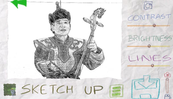 De interface van Paper Camera blijft in de papieren sfeer. De knoppen zijn geschetst en om naar de verschillende effecten te gaan tik je op de getekende pijltjes.