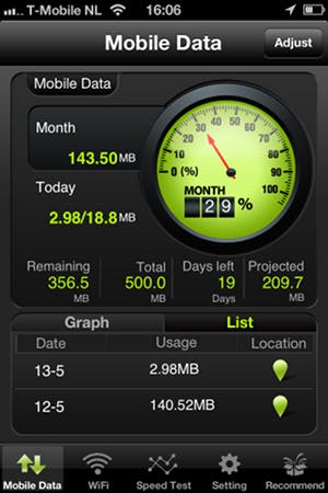 Ga jij wel eens over je databundel heen? Dan is een app die je dataverbruik meet een handige app voor jou. Data Usage Monitor is zo'n app. De app toont hoeveel data je in totaal hebt gebruikt, hoeveel MB je deze maand nog over hebt en hoeveel dagen je hiermee nog moet doen. De app toont op aparte tabbladen hoeveel data je via een 3G-verbinding en via een WiFi-verbinding hebt verbruikt. Heb je onverwachts veel data verbruikt? Dan kan je in een handige lijst terugkijken op welke dag je dit hebt gedaan. Met Data Usage Monitor kan je je dataverbruik dus nauwkeurig in de gaten houden. De app bevat daarnaast een snelheidsmeter, waarmee je de snelheid van je internetverbinding kunt testen. Data Usage Monitor is een prettige en handige app voor iedereen die veel data verbruikt. De app is gratis beschikbaar in de App Store.