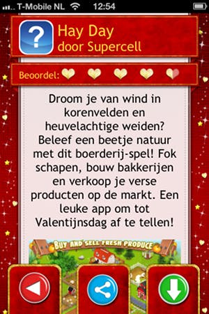 Stuurt niemand je een kaart met Valentijnsdag? Niet getreurd! De app Valentijnsdag 2013 geeft je alsnog een Valentijnscadeau in de vorm van 14 gratis apps. De app vraagt je een korte enquete in te vullen waarin wordt gevraagd naar je geslacht, leeftijd en of je een relatie hebt. Valentijnsdag 2013 selecteert vervolgens een reeks apps die bij jou passen. Ben je bijvoorbeeld single? Dan krijg je andere apps te zien dan wanneer je een gelukkige relatie hebt. Valentijnsdag 2013 zorgt ervoor dat Valentijnsdag voor iedereen een leuke dag is.