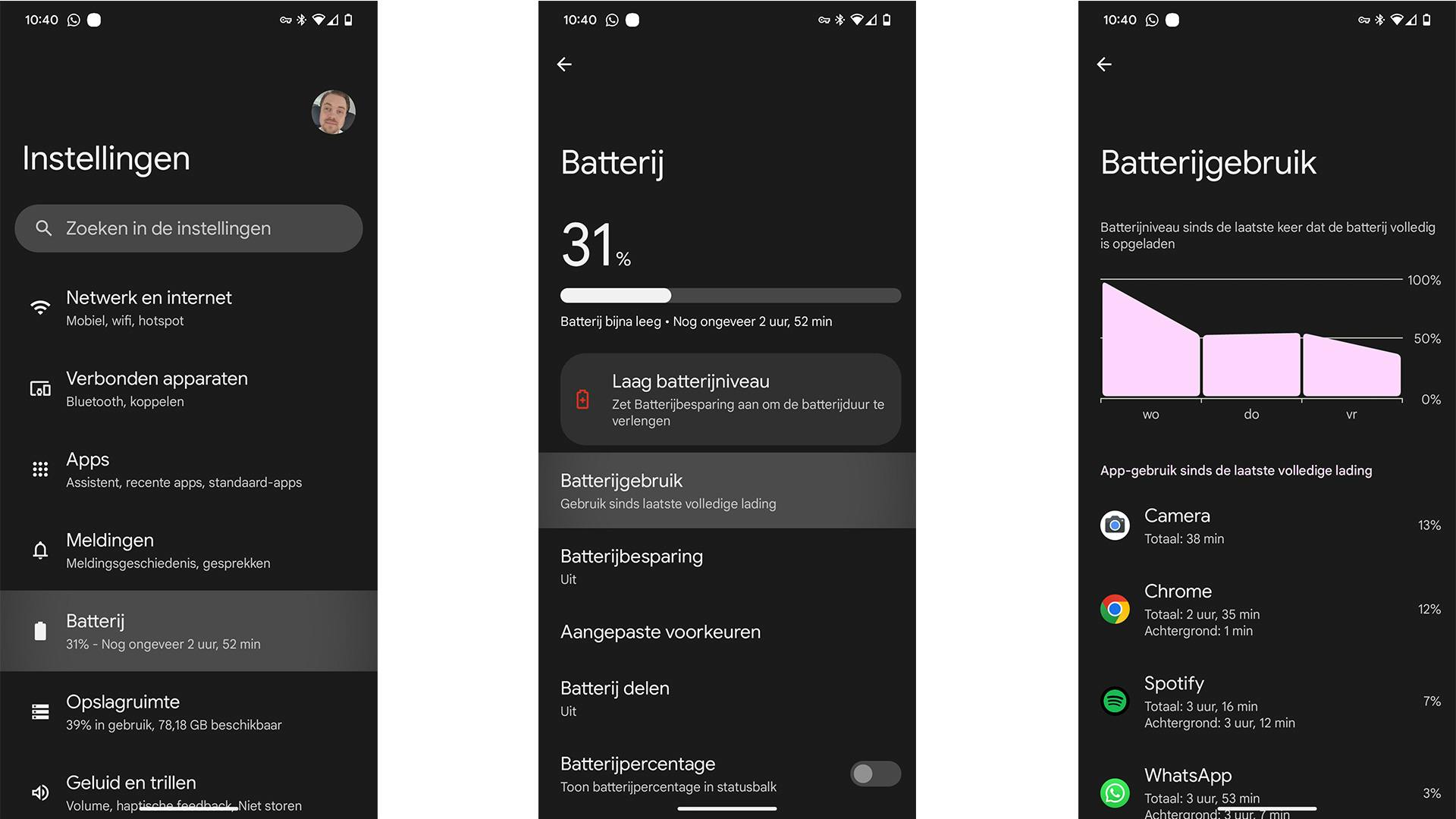 Je gaat hiervoor naar Instellingen > Batterij > Batterijgebruik. Staat daar een app tussen die je niet kent of vind je het vreemd dat een specifiek onderdeel hoog in de lijst staat, dan is het raak. Controleer of je de onbekende app in kwestie kunt afsluiten of verwijderen, en bekijk de komende dagen of het probleem dan is verholpen. Via Google Play Protect worden Android-smartphones veelal goed beschermd, dus de kans dat het gebeurt is klein, maar het is nooit helemáál uitgesloten.